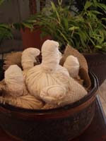 ハーブボール療法は、専門的な知識がなくても比較的簡単に施術することができます。ハーブボールを蒸し器で蒸したら、そのまま取り出して患部に当てます。熱いうちには、軽く叩くような動作でやけどしないように注意して行います。適温になったら、強く押し付けたり、ボールを使って回したり揉むようにして施術します。 |
